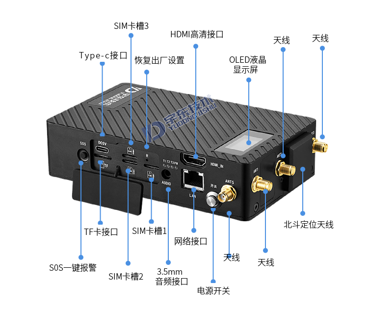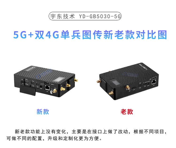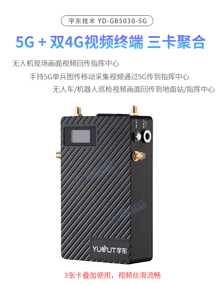 YD-GB5030-5G單兵圖傳,具備三個(gè)SIM卡槽,同時(shí)支持一個(gè)5G網(wǎng)絡(luò)和兩個(gè)4G網(wǎng)絡(luò), 5G便攜式多卡高清視頻終端采用嵌入式系統(tǒng)架構(gòu),采用高性能H.265編解碼處理器設(shè)計(jì)。設(shè)備支持視頻采集、編碼壓縮、傳輸、雙向?qū)χv功能。